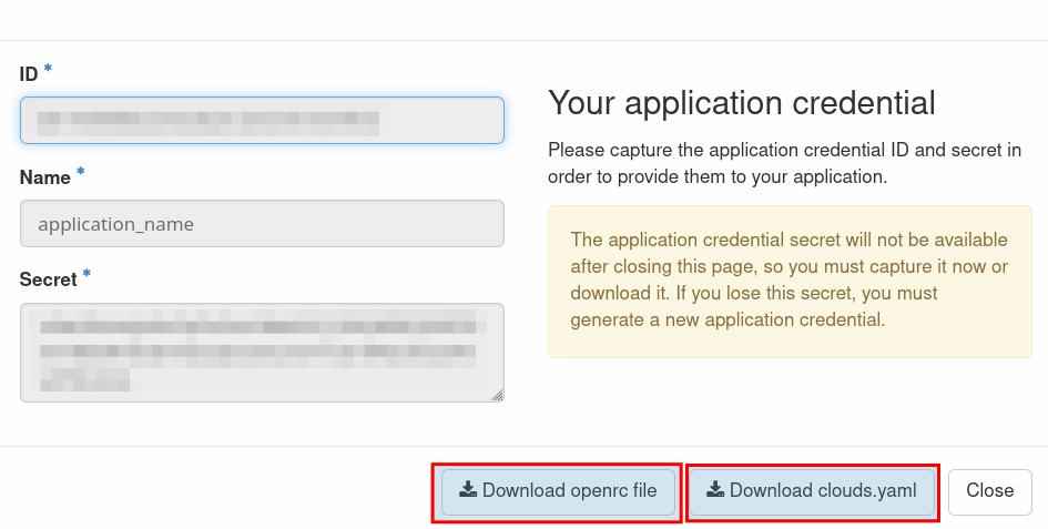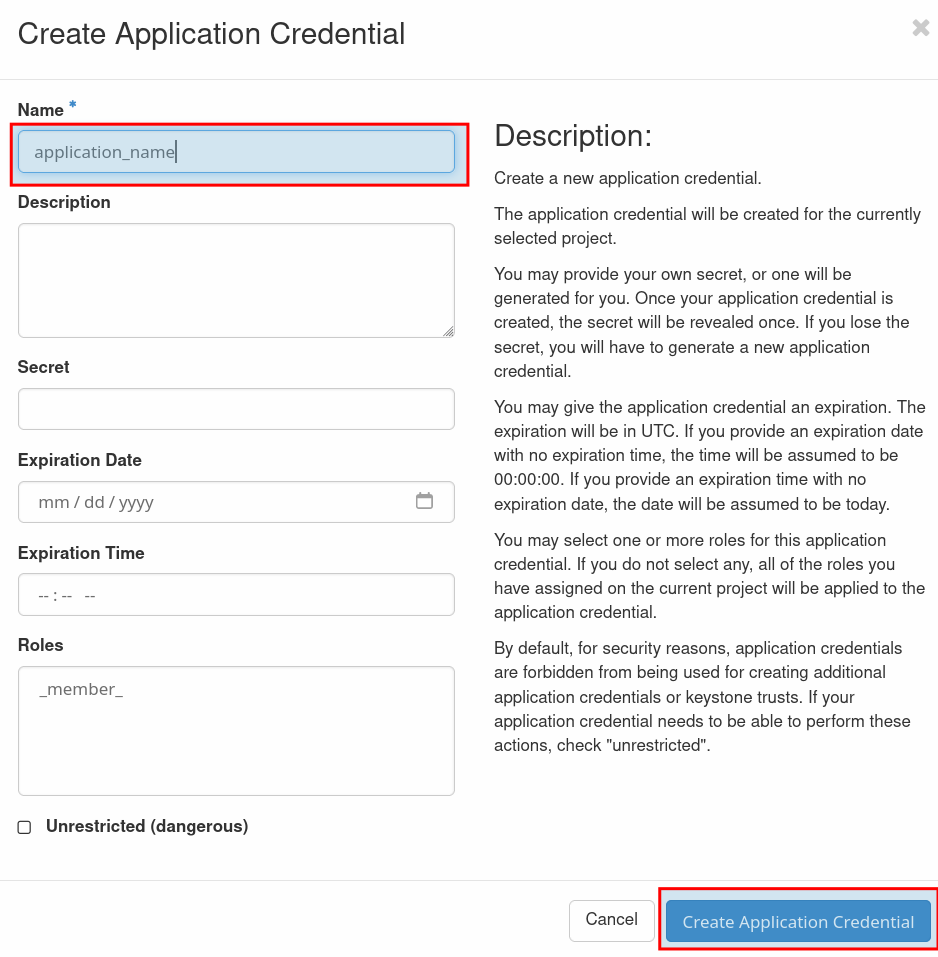- Create Application Credentials: In the OpenStack dashboard, go to your user menu (top right), click "Application Credentials", and create a new credential.