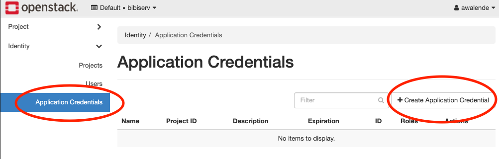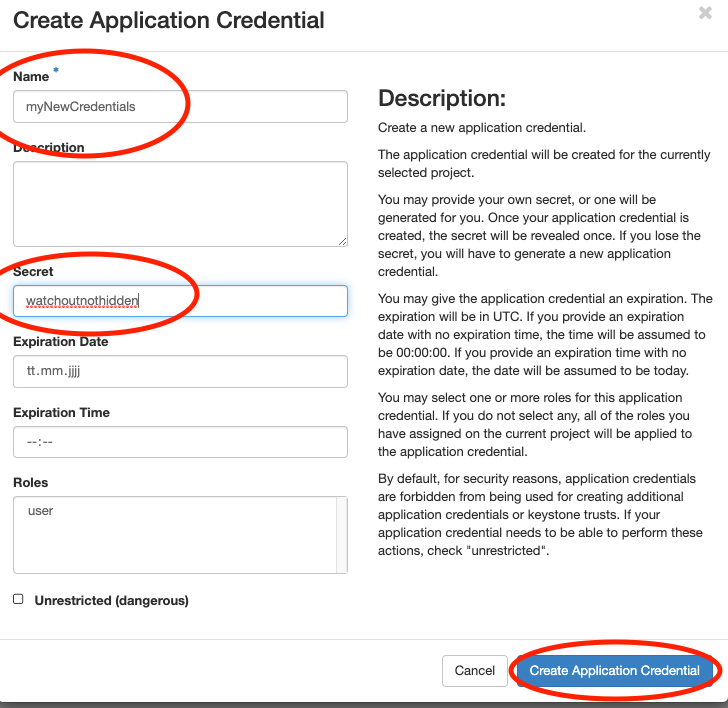 In this section you will create an application credential and download the autogenerated clouds.yaml. clouds.yaml contains all required authentication information. Follow the images: