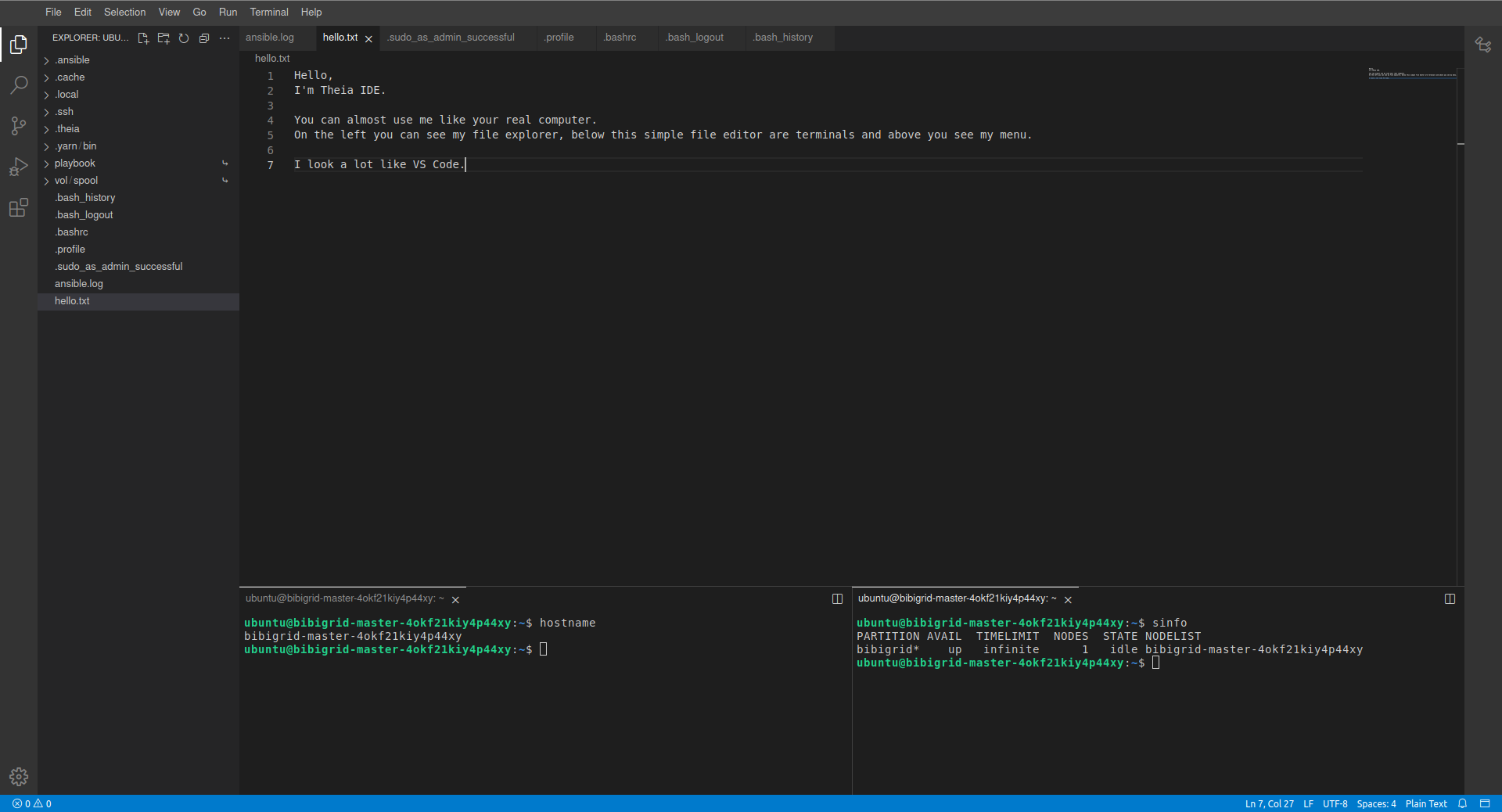BiBiGrid creates one partition for every cloud (here `openstack`) and one partition called `all` containing all nodes from all partitions. Since we are only using one cloud for this tutorial, we only have `openstack` and `all`.However, dealing with the cluster from just a terminal can be quite bothersome. That's were Theia Web IDE comes in. Log out of your ssh connection for now.