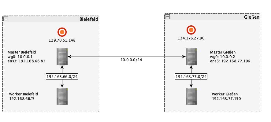 This section will describe a proof of concept of such a hybrid cloud approach. This minimal setup will consist of a cluster created with BiBiGrid running in the Bielefeld cloud. This cluster will consist of one master and one worker node. Additional a VPN node, a pseudo master which just relays traffic between the two cloud locations, and a worker node will be created in the Gießen cloud. The master node and the VPN node will be connected over a VPN created with Wireguard. The local workers in turn are connected to their master/VPN node via their local subnet.