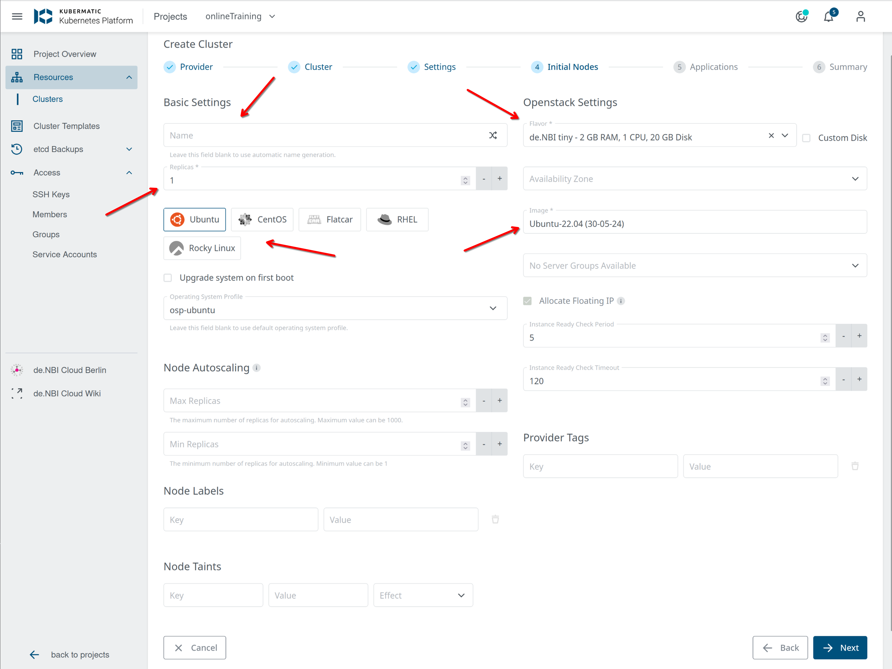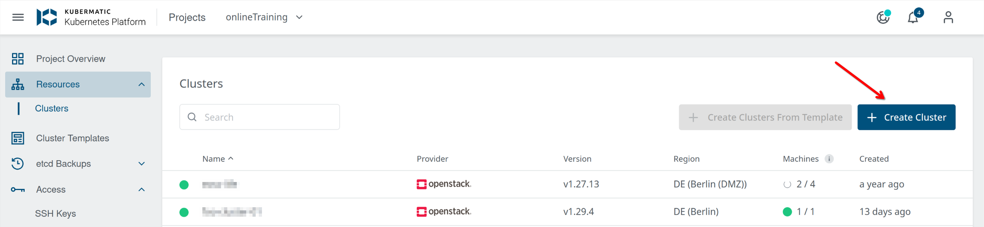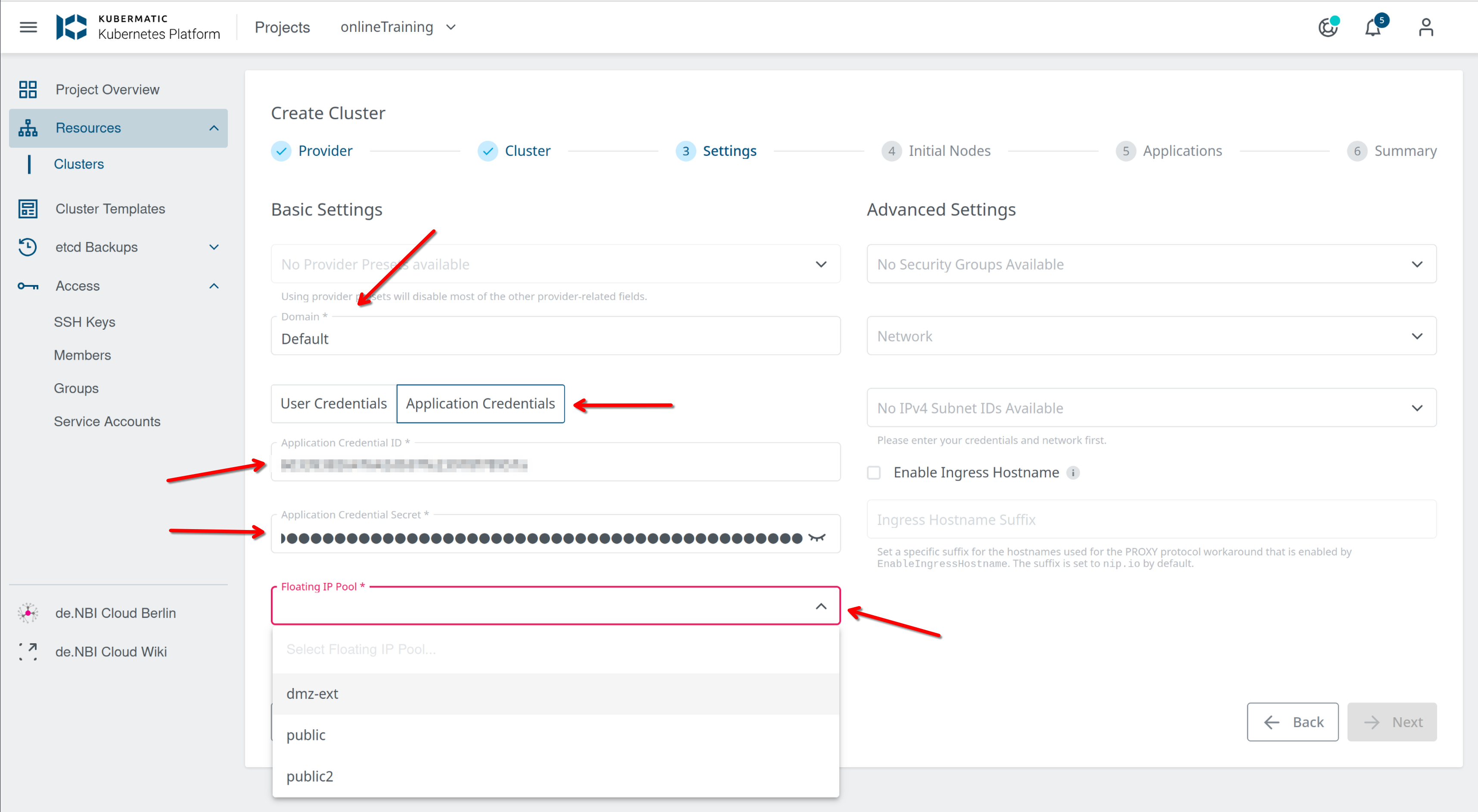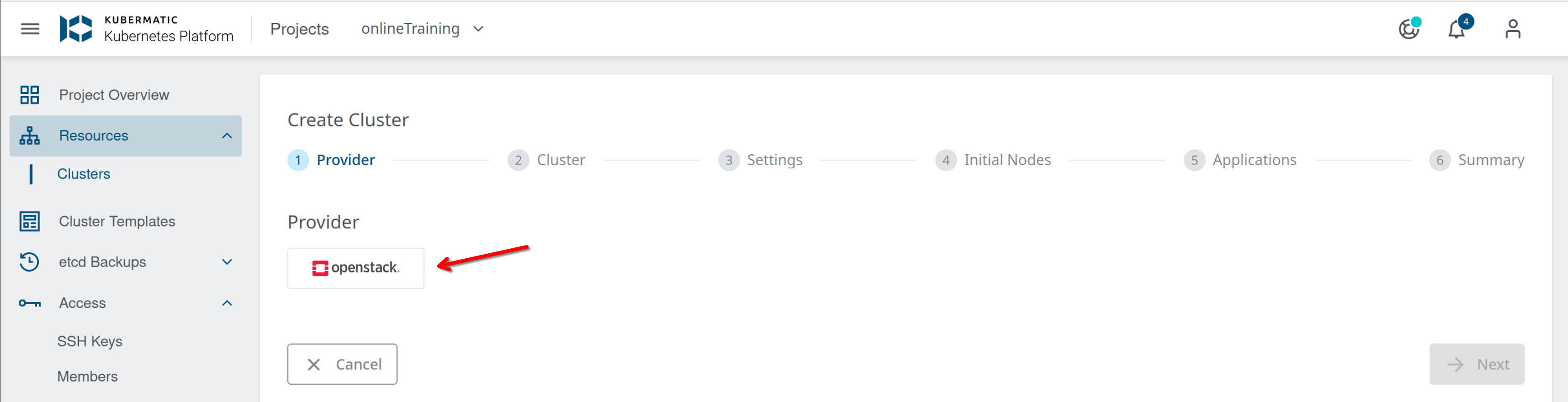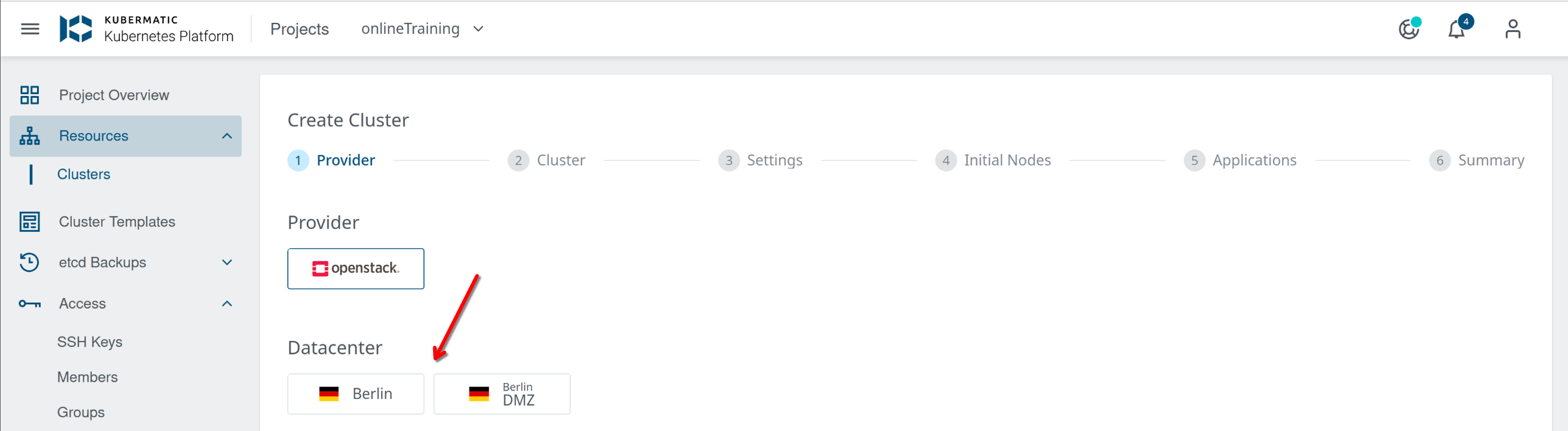 Note: If you have access to multiple projects, you need to take care, that you are using the right credentials for the project that you select as "Project". Kubermatic will always display all projects that you can see, but the cluster will be spawned in the project that belongs to the application credentials (this is a OpenStack thing).