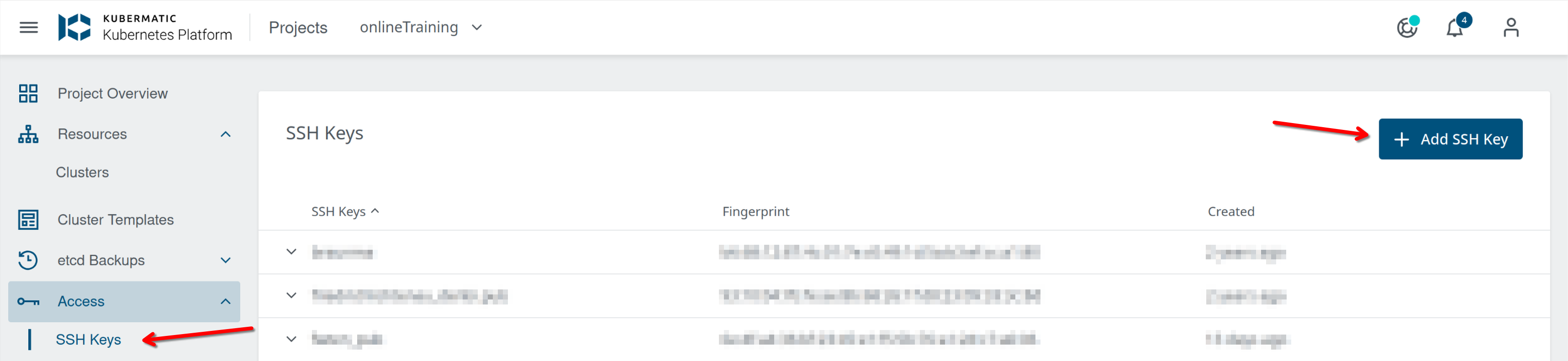 When you have the application credentials, it makes sense to upload a SSH key to your Kubermatic project. With that, you have the ability to access the K8s nodes created in a later step via ssh.