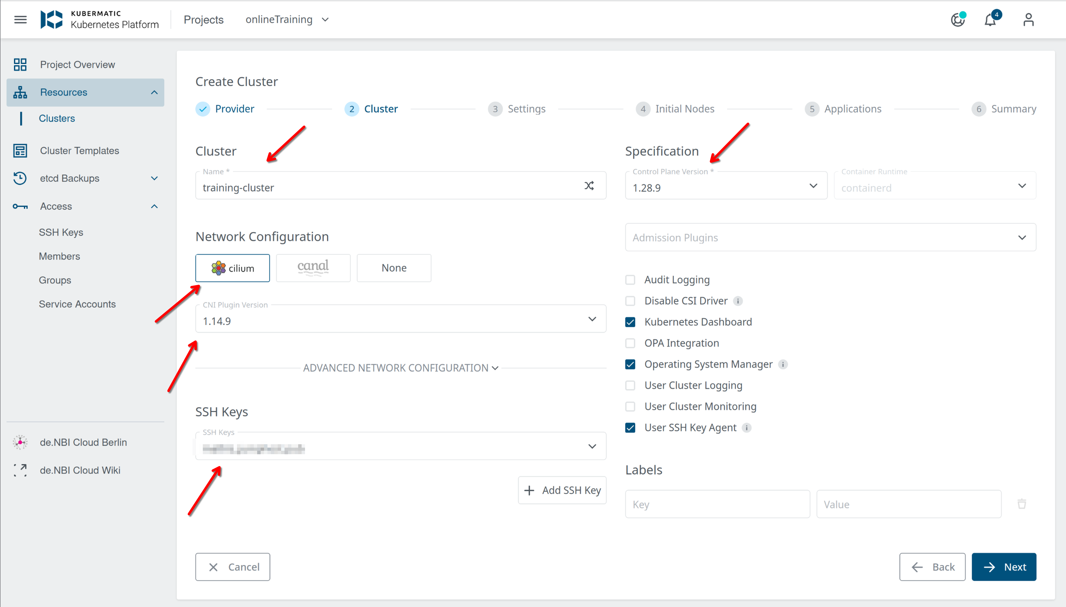 Here you can configure your basic cluster settings, like name and version. For most setups this is sufficient. Note: you can always start with an "older K8s" version and issue an upgrade later. The default network provider for the cluster is cilium the CNI Plugin Version can be left unchanged.