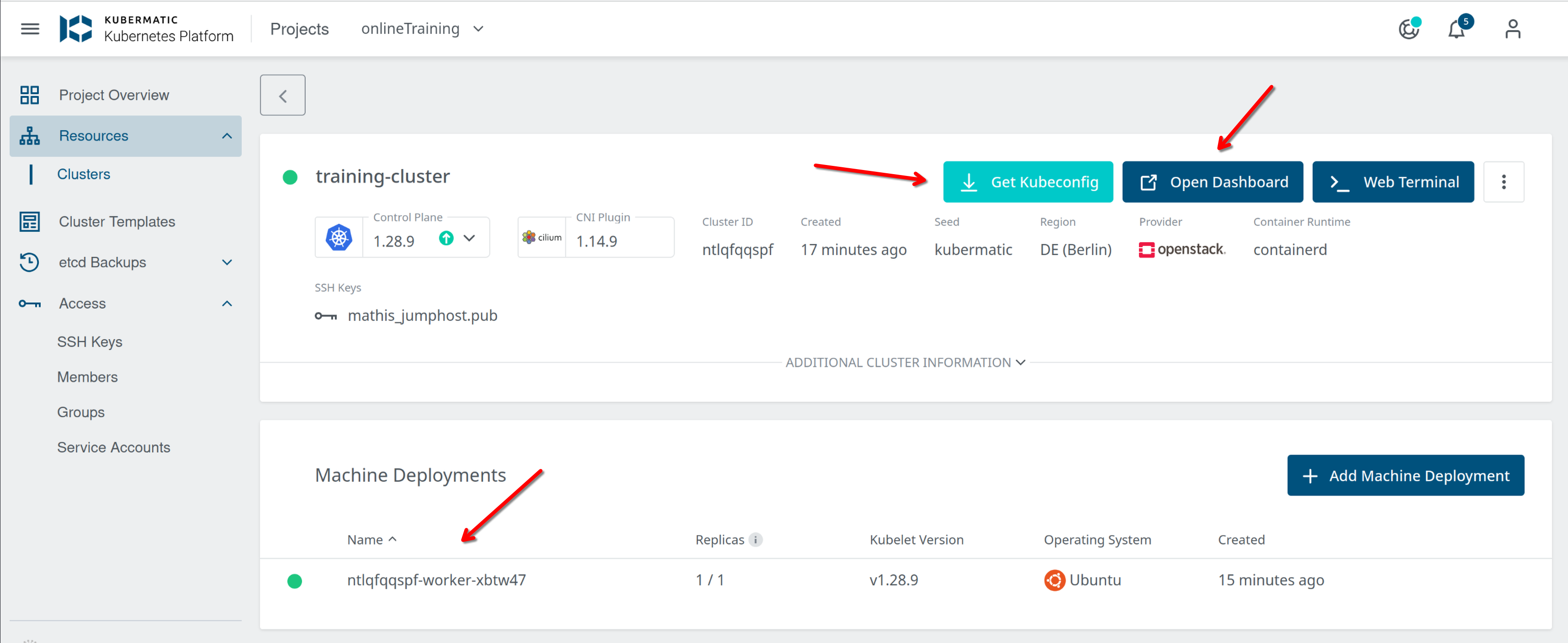 You can access the K8s dashboard and download your kubeconfig with the buttons at the top right.