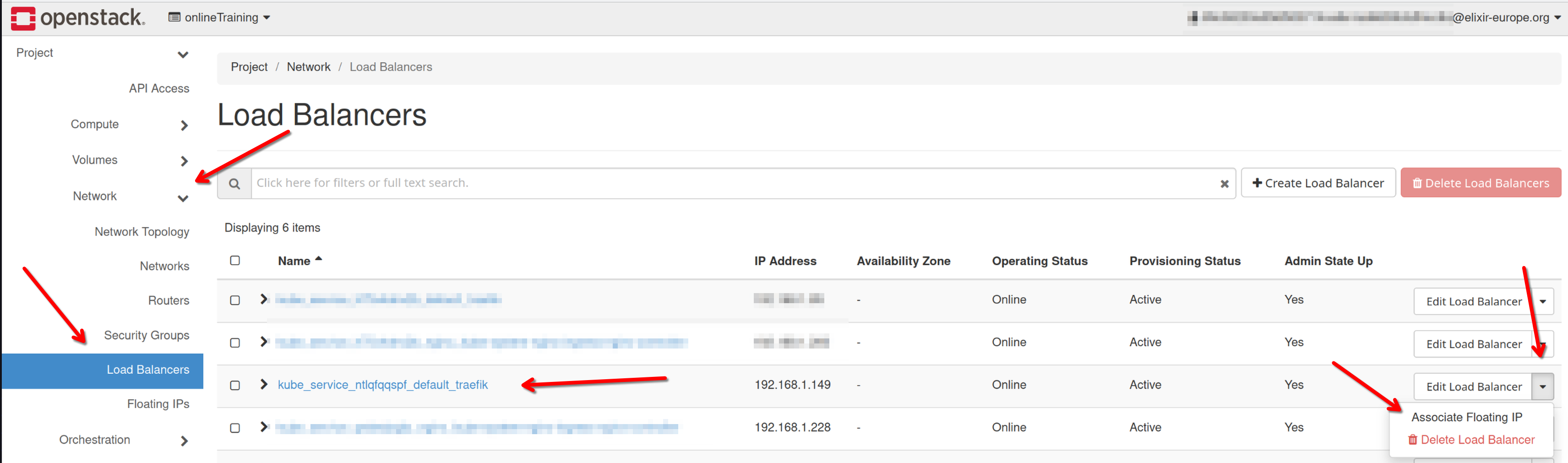 This will create a loadbalancer in OpenStack and you can assign a floating IP to it. To allocate a floating IP, go to your OpenStack peject and go to Network → Loadbalancers and look for the loadbalancer with the cluster id from Kubermatic in the name. Click on the small arrow on the right and select Associate Floating IP. Select the Floating IP that was given to you when applying for a public IP.