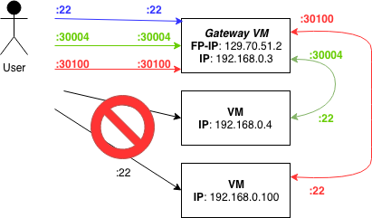 The image above explains the basic idea. If I have created three VMs (192.168.0.3, 192.168.0.4 and 192.168.0.100) in my project network (192.168.0.0/24) and I have just one public IP address (129.70.51.2) available, I can access only one VM at once. I can use of course the public available VM as jump host, but this is not very handy for most situations. The idea is to use unneeded ports of the so called gateway vm to access the VMs.