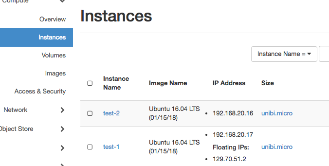 To figure out how this can be achieved, start two instances and assign a floating ip to one of them. In my example I started two VMs named test-1 and test-2 and assign the floating ip to the first one.
