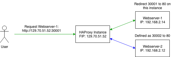 Here the user accesses port 30001 on the HAProxy-node. HAProxy then has a configuration which proxys all traffic from Webserver-1 back to the user.