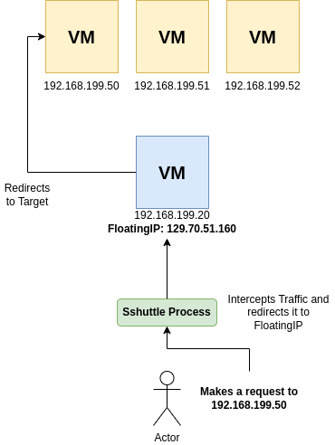 The effect is, that the local client becomes part of the private network. The process of intercepting and forwarding traffic is hidden in the background. This enables a secure way of interacting with all instances via a secure SSH tunnel. Therefore, there is no need to open additional ports in a Security Group and expose possibly insecure services to the internet.
