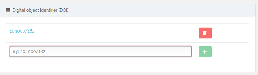 In your project overview you will find this field where you can enter a DOI, which will be associated with your project. There is no limit on the number of DOIs you can associate with your project. Clicking the delete button will remove the DOI and its association to your project.