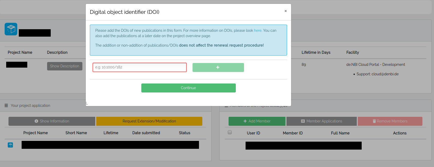 When requesting an extension/modification of your project, you will be asked if you have any new publications that were made during your work with the de.NBI Cloud or in which the de.NBI Cloud is mentioned. After clicking 'Yes', you will have the opportunity to add one or more DOIs and continue to your modification request.