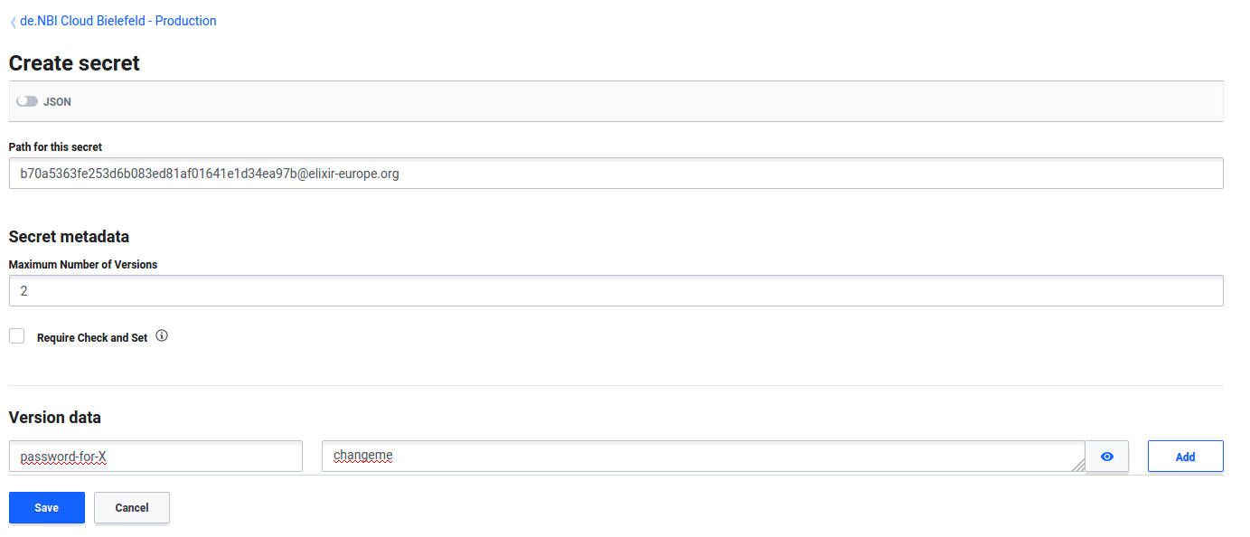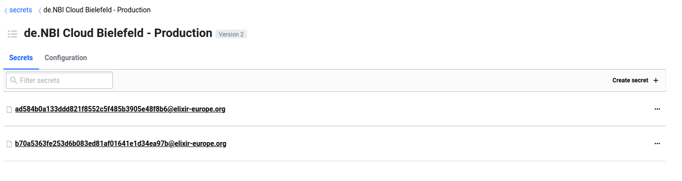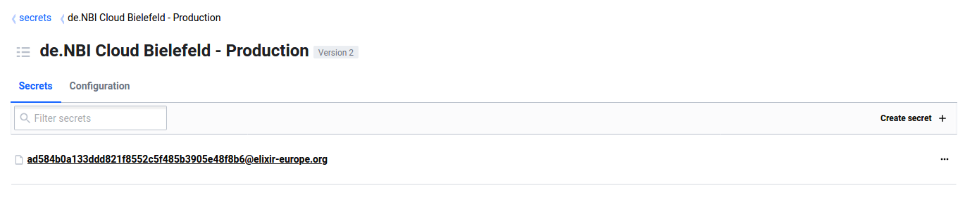 After logging in you should see the 'Secrets' tab. Click on your compute center, where you will find paths leading to a protected key/value store.