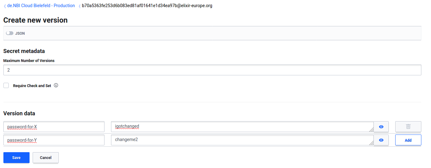 Here you can put in a new version of secret key/value pairs and click 'Save'. Also you may delete key/value pairs in the new version by clicking on the trash icon.