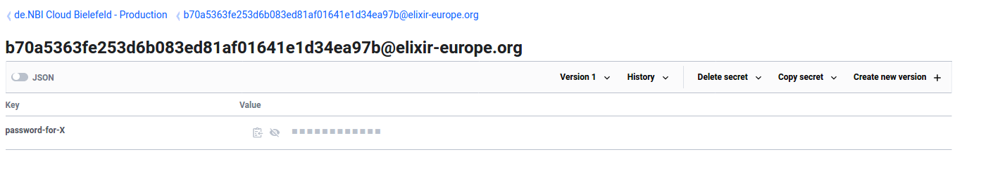 You can also delete specific versions, by clicking on the Elixir ID of the user you want to delete versions from and then clicking on 'Version X' in the paths headbar. Here you can delete or destroy the specific version. To delete the whole path, click on 'Delete secret' in the paths headbar.