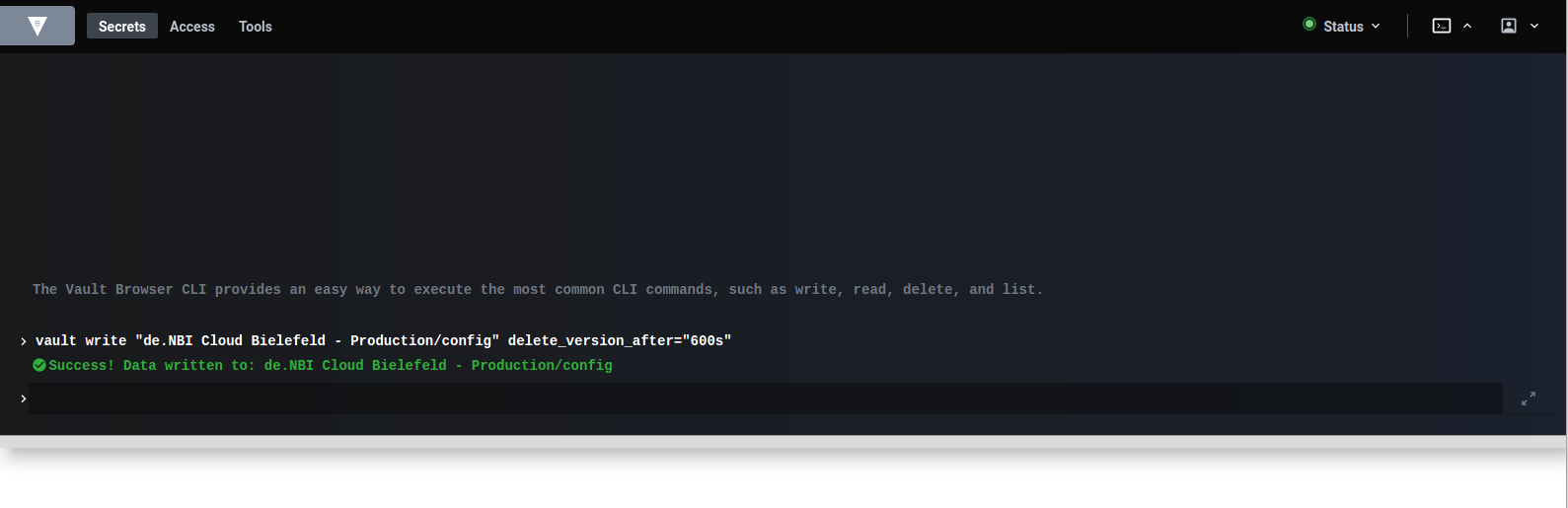 vault write "de.NBI Cloud Bielefeld - Production/config" delete_version_after="600s"
