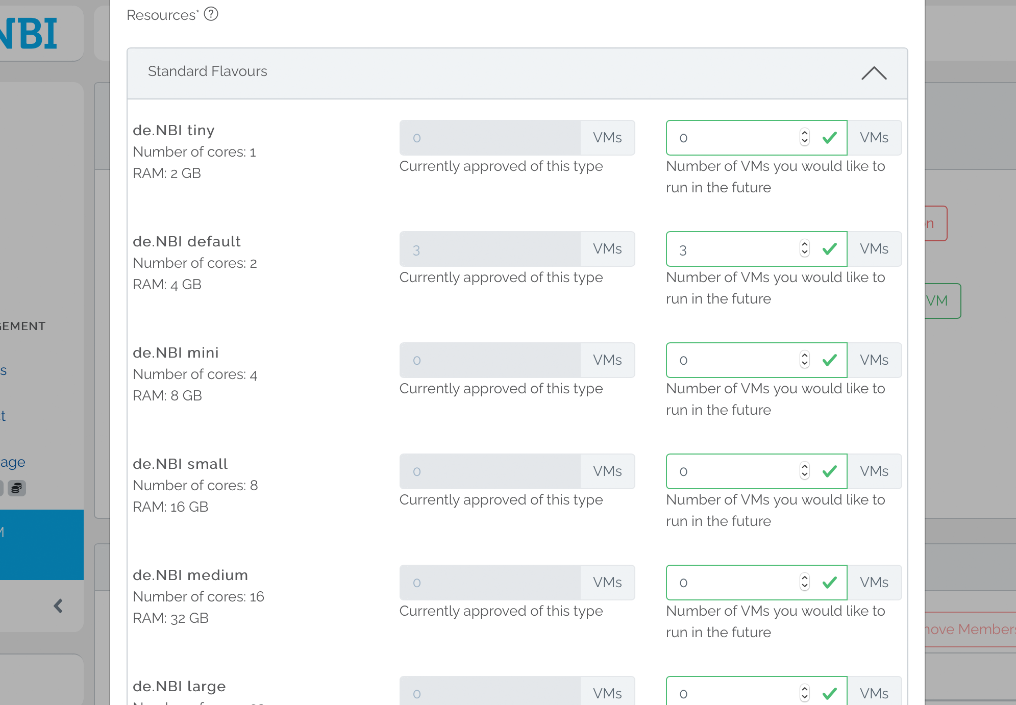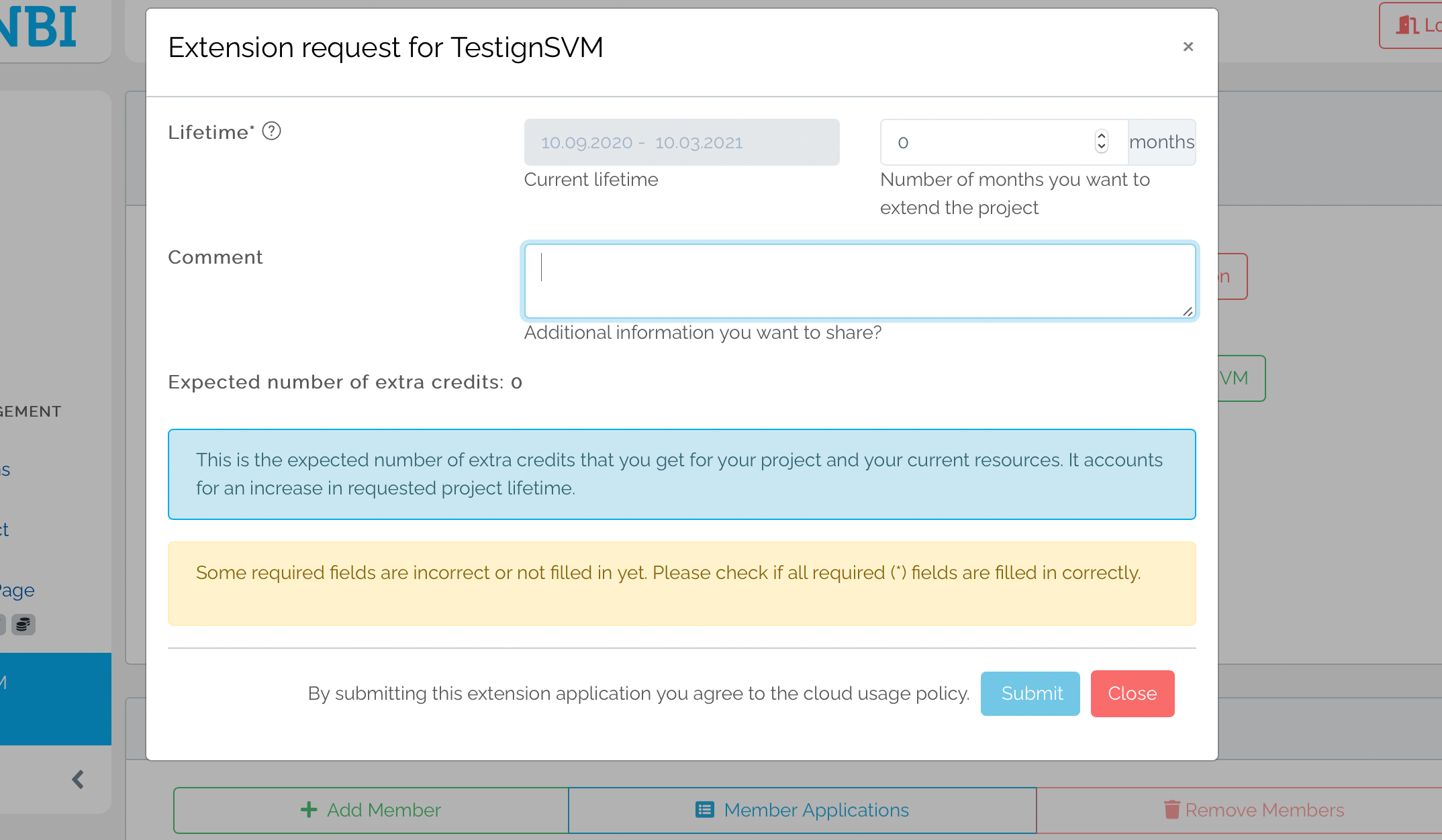 The resources or the lifetime of a running project can be adjusted very easily via the project overview. For this purpose two separate forms are available. It is also possible to apply for additional credits. All requests are processed and approved or rejected independently. The status of the requests can be seen in the project information on the project overview page.