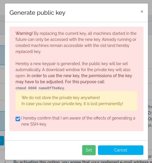 If you do not save the private key generated for you, it will be irretrievably lost. We do not save the generated private keys for you. If you have cancelled or forgotten to download the key, you must repeat the process with a new key. Please note that you will have to change the permissions of the key file as written in the notification you just confirmed.