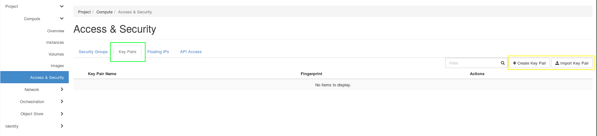 If you do not have an SSH key or you are not sure whether you have one, please generate one by following the instructions based on your operating system (Windows/Linux) in the next Generate SSH-Keys section. You can import your SSH Key by clicking on Import Key Pair (right button in the yellow box)(e.g.: .pub in Linux or .key in Windows). Afterwards, your key should be listed on the key overview page. In chapter Getting Access to the Instance we will use this key.