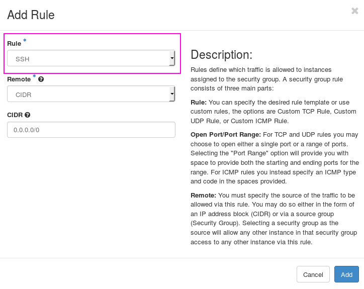 In the Rule field, select SSH (maybe you have to scroll a little bit down)(pink box). Click on the blue Add button.