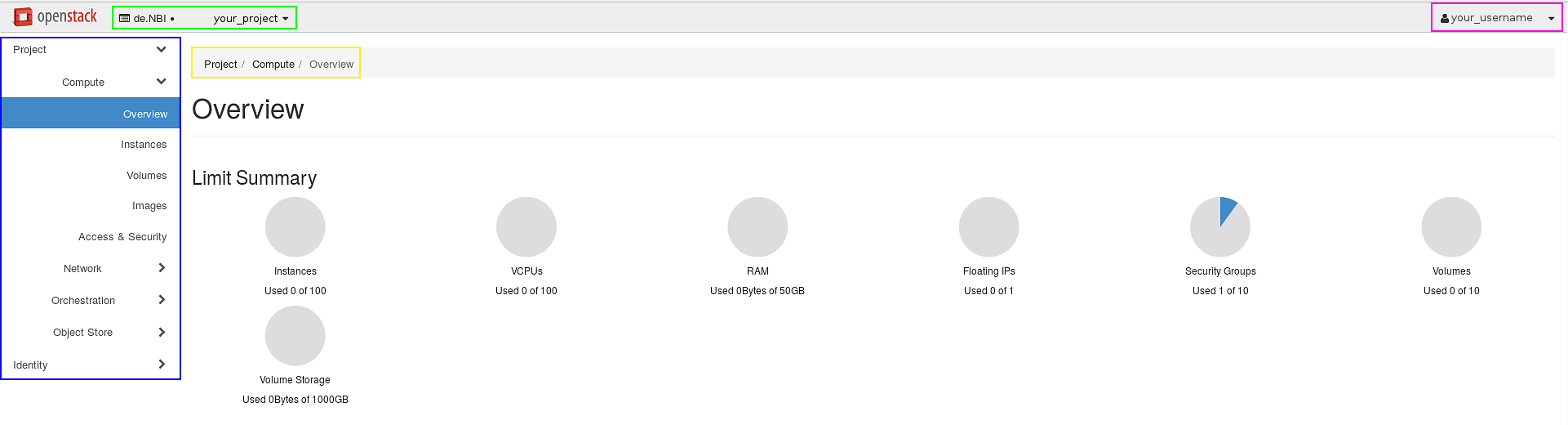 On the left is the control menu (blue box) to navigate you through your project. The current page is highlighted in blue (In our case Project -> Compute -> Overview). This information can also be found in the yellow box. This could help you navigate to the right page, in the case you have trouble to find the current page we are operating on.