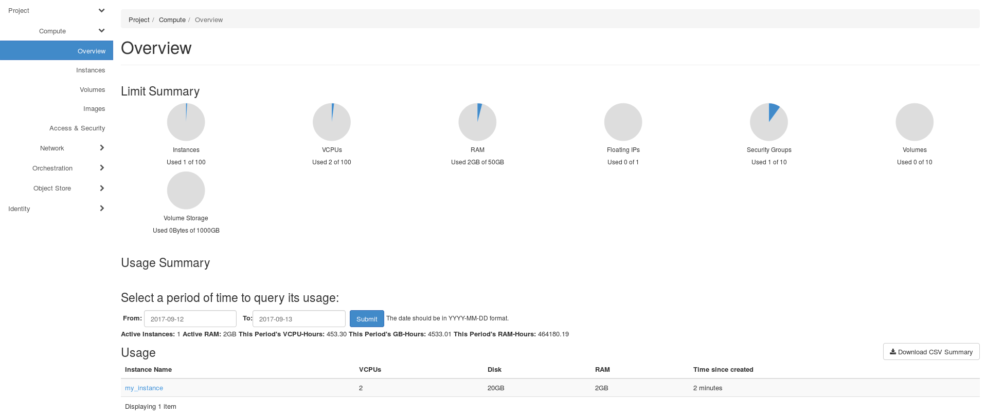 If the login was successful, you should see the overview page of the OpenStack dashboard: