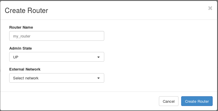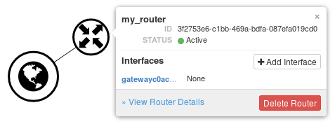 Fill in the Router Name and select the external for the External Network. Click on the blue button Create Router. Your network topology should look like this: