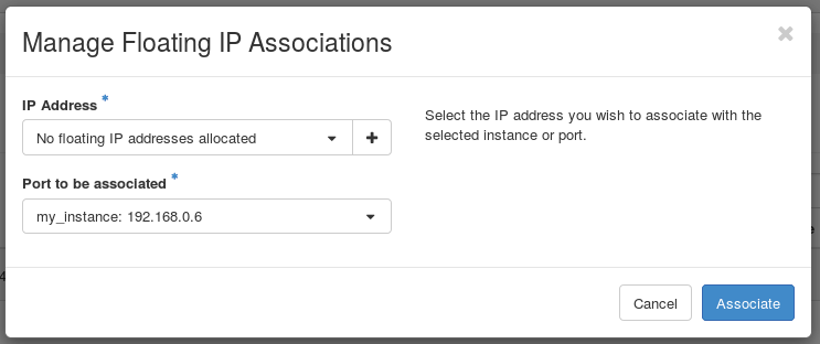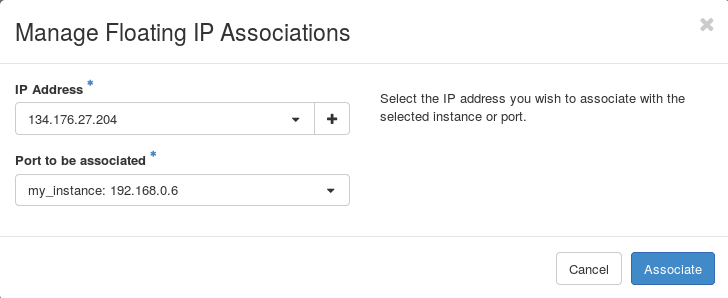 Click on Associate to associate your new floating ip to your instance. Now, your instance should have two ip addresses: