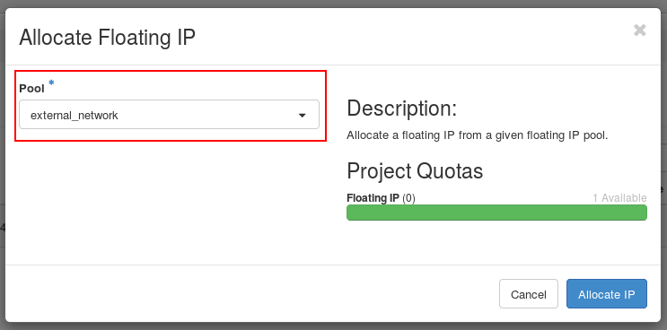 Select the external_network in the pool field (red box) and click on the blue Associate IP Button: