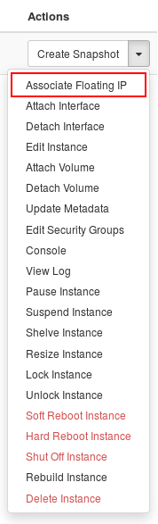 In order to connect to your virtual machine (= instance), it must be related to a public network address. A private, fixed IP address, used "for communication between instances", will be assigned automatically to the instance. An IP address "for communication with networks outside the cloud, including the internet" have to associated manually. Within the "Instances" tab, determine the machine for which a floating IP should allocated. To get access to our instance, we need to associate a Floating IP to it. Click on the arrow next to Create Snapshot. A dropdown menu appears: