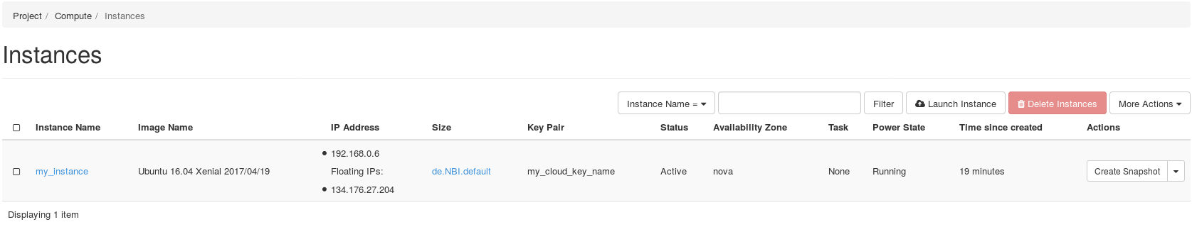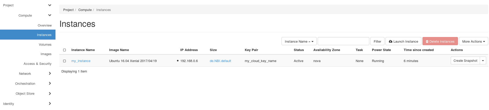 On Project -> Compute -> Instances we can see our instance and that it is running: