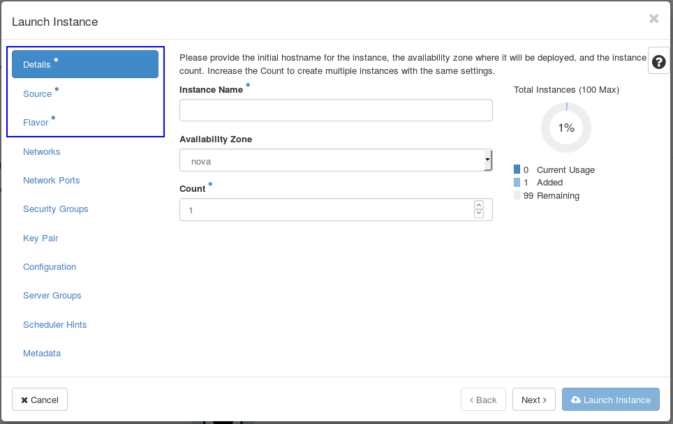 Click on the Launch Instance button (pink box on the picture in the last chapter). A new Launch Instance form will appear:
