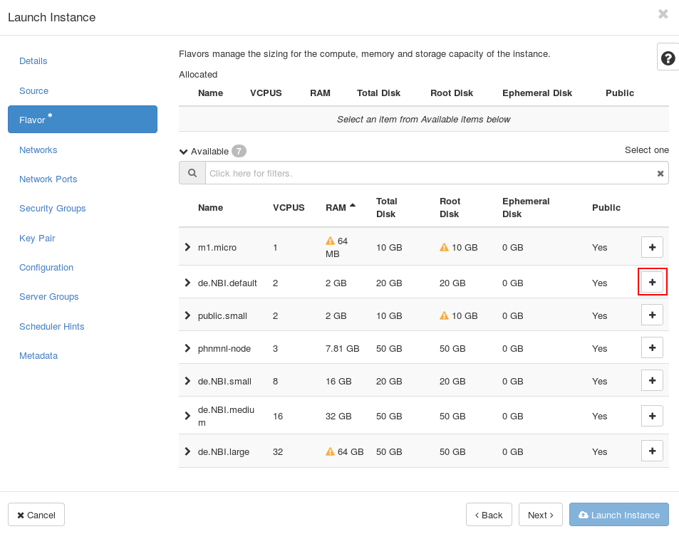 A flavor defines a virtual machine setup by defining parameters like hard disk size, available memory or CPU core number. Click on the + Button next to de.NBI.default flavor (red box). Now the star next to Flavor should disappear. You can click on the blue Launch Instance button to launch your instance. Your Network Topology Graph should look like this: