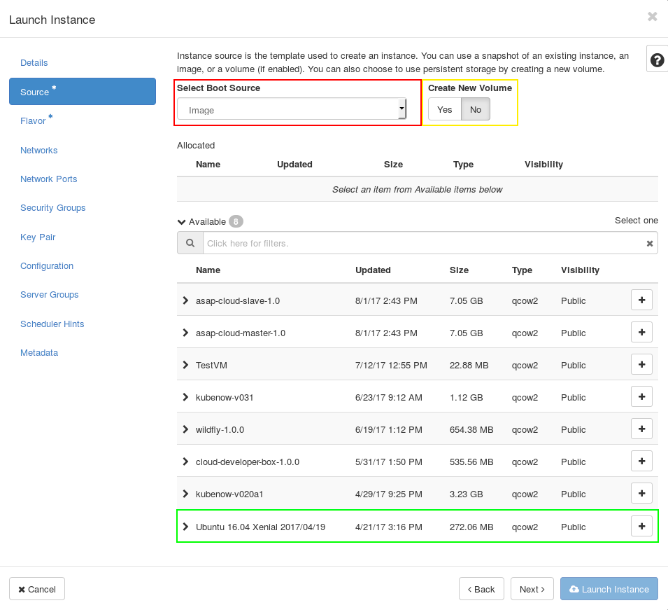 - Select an image as source to create the instance (e.g. Ubuntu 16.04 Xenial 2018/01/09 (green box))