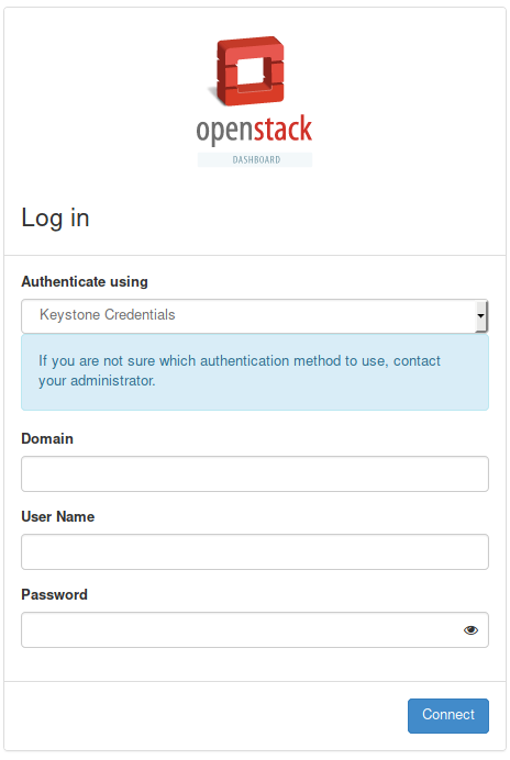 Please choose in the Authenticate using field, the ELIXIR AAI tag and click on the Connect button. You should be redirected to the Openstack Dashboard. If you have any problems or need help logging in, please do not hesitate to contact the Cloud Support of your site. You can find the corresponding support site in the Compute Center Specific section.