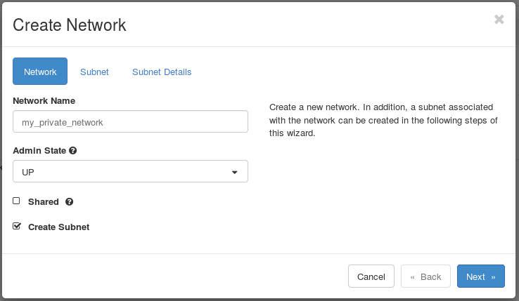 Now, we need a network. Click on Create Network (yellow box). A three-part form should appear (Network, Subnet, Subnet Details):