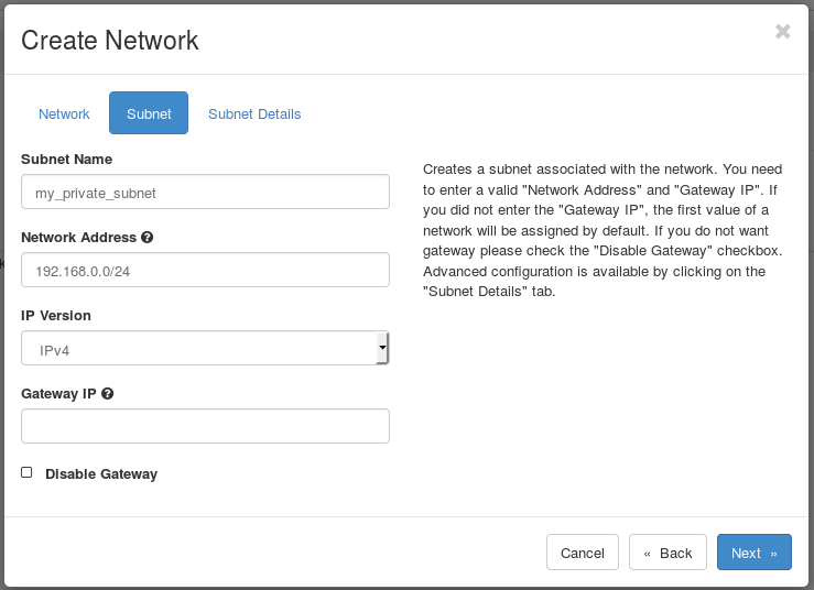 Here, you have to specify your Subnet Name and your Network Address (e.g. 192.168.0.0/24). After this, click on the blue Next button again. On the third page you can specify additional attributes for the subnet. For more information hover over the questionmarks. In this guide we skip this step and click on the blue Create button.