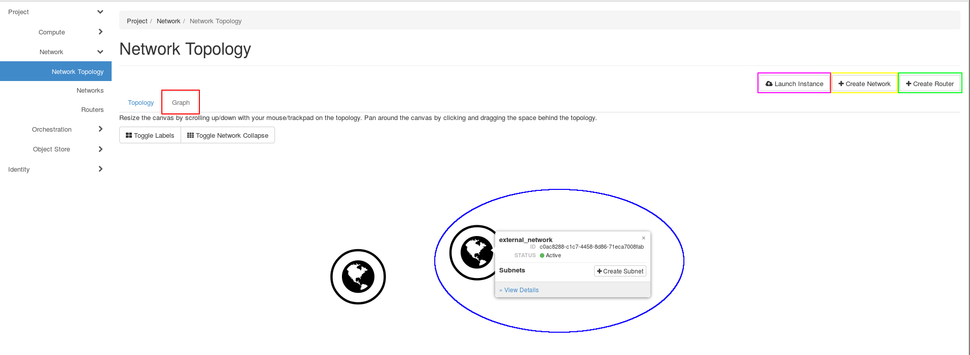 We want to create a network to get access to our in the near future launched instances. First, we get to the Network Topology page: