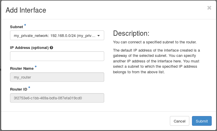 We want to connect our Router with our new Network. Click on your Router. A tooltip should pop up. Click on Add Interface. A form will appear: