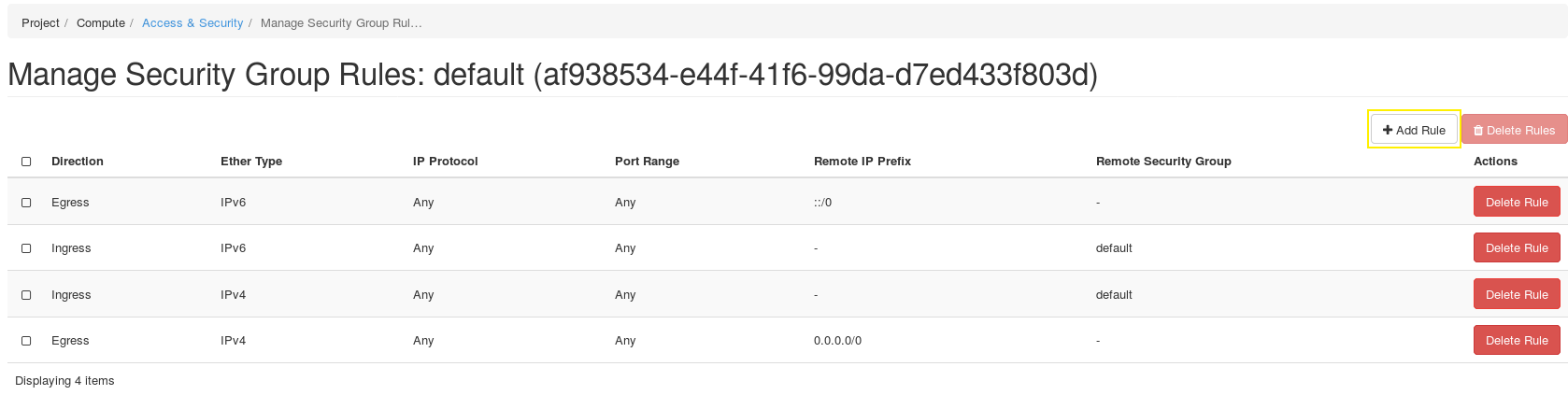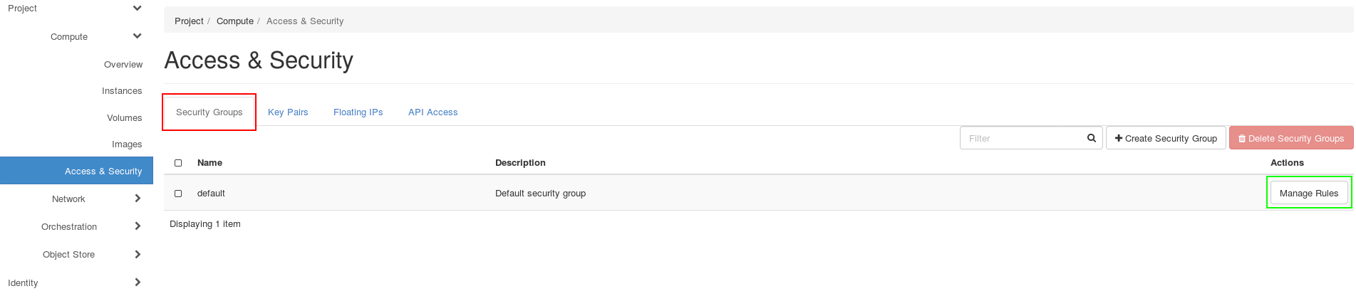 Click on the Security Groups Tab (red box). You should see one security group with the name default. Click on Manage Rules next to the default security group (green box).